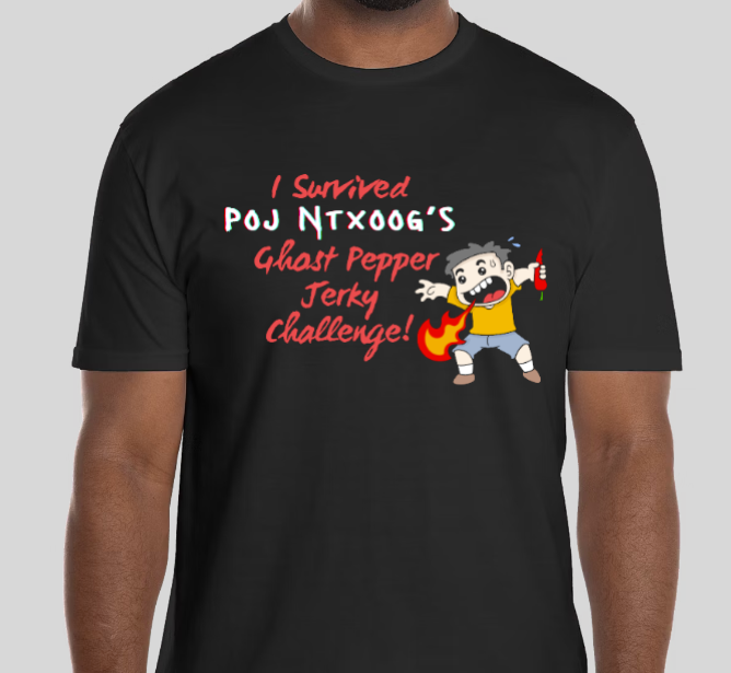 Complete the Challenge: To qualify for a free T-shirt, participants must eat a 1 3oz bag of Poj Ntxoog Ghost Pepper beef jerky within 5 minutes without consuming any other food or beverages during the challenge.